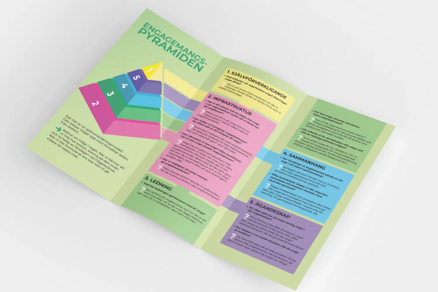 I början var ett av målen att ta fram en checklista som organisationer kunde använda för att identifiera hur de bäst arbetar med ungas engagemang. Under projektets gång blev det dock tydligt att det inte bara finns en väg till framgång. Istället inspirerades projektet av Maslows behovstrappa – en modell som handlar om mänsklig motivation. Resultatet blev Engagemangspyramiden, som sammanfattar fem nyckelområden på olika nivåer för att hjälpa föreningar förstå och stärka ungas delaktighet. Du kan ladda ner brochyren med modellen på projektets hemsida.